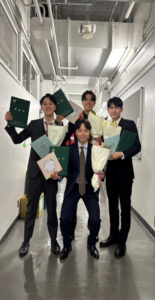 卒業証書と後輩からのお祝いを手に記念写真。安部湧太を囲むように(後列左から)森口永大、高宮エヴァン、寄本翔生(青学記念館地下1階の部室前で)